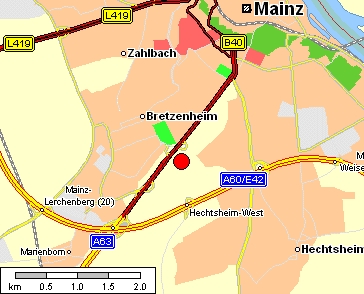 Über die A 63 und die B 40 bis Abfahrt Mainz-Bretzenheim.